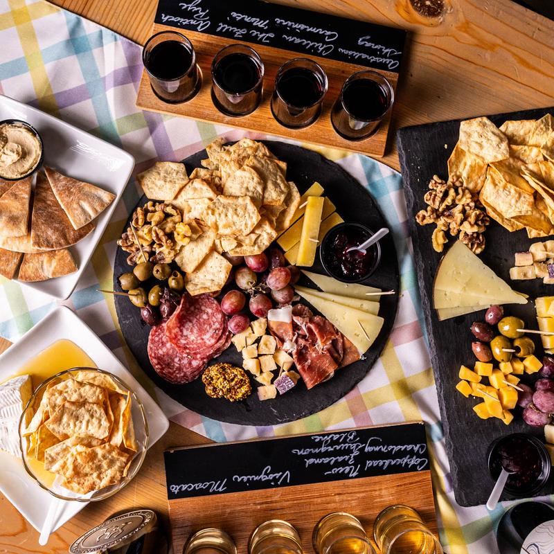 Salami and Parma Ham with 3 Cheeses (Manchego, Kerrygold Dubliner, & Seasonal Cheese) served with grapes, walnuts, olives, gluten-free crackers, grain mustard, and jelly.